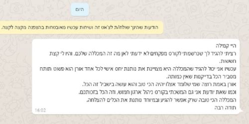 רציתי להגיד לך שנרשמתי לקורס מפקחים לא ידעתי לאן ומה זה המכללה שלכם, והיו לי קצת חששות, עכשיו אני יכול להגיד שהמכללה היא מצוינת, את נותנת יחס אישי לכל אחד, אורן הוא פשוט תותח, מסביר הכל בדייקנות שאין כמותה, אורן באמת רוצה שמי שלומד אצלו יהיה הכי טוב והוא עושה בשביל זה הכל. וכמו שאת יודעת אני גם המשכתי בקורס ניהול ארגון חמוש, וזה בכל בזכותכם. המכללה הכי טובה שרק אפשר להגיע ובמיוחד נותנת את הכלים להצלחה. תודה רבה.