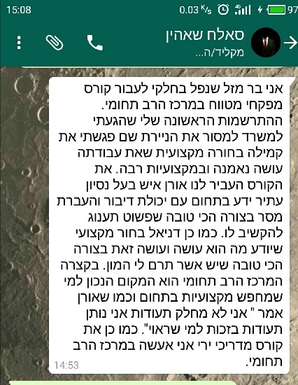 אני בר מזל שנפל בחלקי לעבור קורס מפקחי מטווח במרכז הרב תחומי. ההתרשמות הראשונה שלי שהגעתי למשרד למסור את הניירת שם פגשתי את קמילה בחורה מקצועית שאת עבודה עושה נאמנה ובמקצועיות רבה. את הקורס העביר לנו אורן איש בעל ניסיון עתיר ידע בתחום אם יכולת דיבור והעברת מסר בצורה הכי טובה, שפשוט תענוג להקשיב לו כמו כן דניאל בחור מקצועי שידע מה הוא עושה ועשה זאת בצורה הכי טובה שיש אשר תרם לי המון. בקצרה המרכז הרב תחומי הוא המקום הנכון למי שמחפש מקצועיות בתחום וכמו שאורן אמר ” אני לא מחלק תעודות אני נותן תעודות בזכות למי שראוי”. כמו כן את קורס מדריכי ירי אני אעשה במרכז הרב תחומי